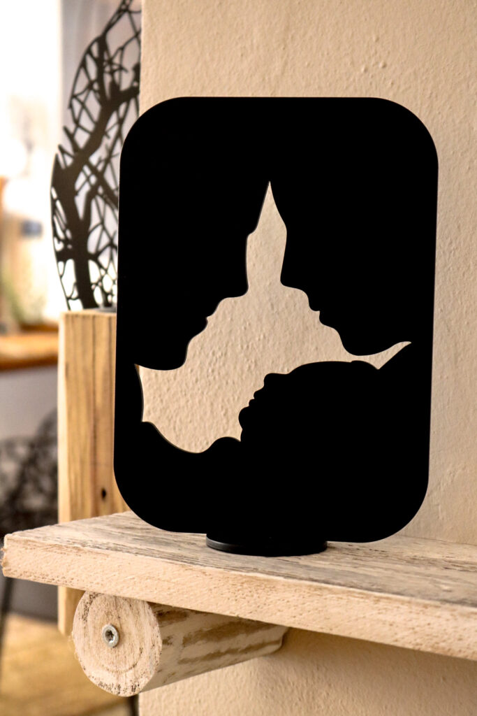 Die kleine Familie“ ist ein herzerwärmendes Schattenspiel, das die innige Verbindung zwischen Eltern und ihrem Baby auf zauberhafte Weise einfängt. Dieses kunstvolle Schattenspiel zeigt die Eltern, wie sie liebevoll ihr Baby im Arm halten und zelebriert die bedingungslose Liebe und das Glück, das eine Familie ausmacht. Die zarten Schatten und Konturen verleihen diesem Kunstwerk eine besondere Ästhetik, die in jedem Raum eine berührende Atmosphäre schafft. „Die kleine Familie“ ist nicht nur ein visueller Genuss, sondern auch eine wunderbare Geschenkidee für frischgebackene Eltern, um die einzigartigen Momente des Familienlebens zu feiern.