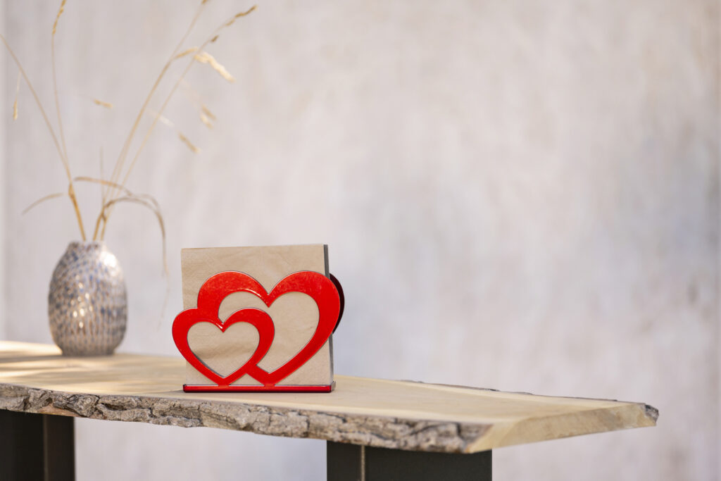 Elegant und modern – dieser Serviettenhalter in tiefem Schwarz zeigt zwei stilisierte Herzen, die für Zusammenhalt und Liebe stehen. Ein dezentes, aber wirkungsvolles Detail für jede Tischdekoration, das sowohl schlichte Eleganz als auch emotionale Tiefe ausstrahlt.