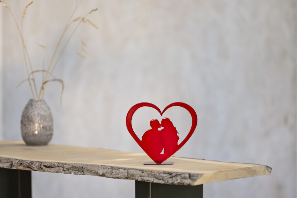 In elegantem Schwarz zeigt diese Skulptur ein Paar, das sich im Herzen umarmt – ein Symbol für Liebe und Zusammenhalt. Das schlichte, moderne Design in Kombination mit der kraftvollen Symbolik macht dieses Kunstwerk zu einem stilvollen Highlight, das die Schönheit der Liebe zeitlos einfängt.